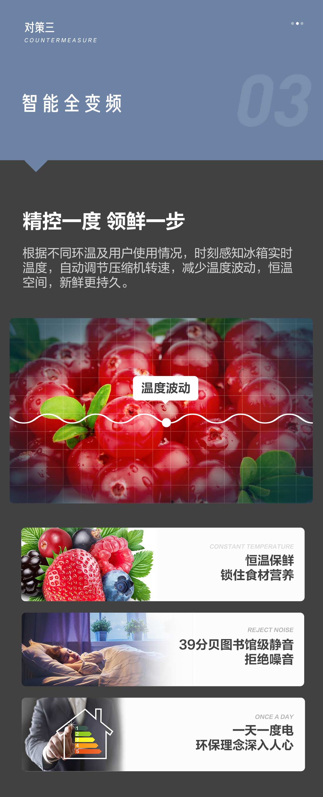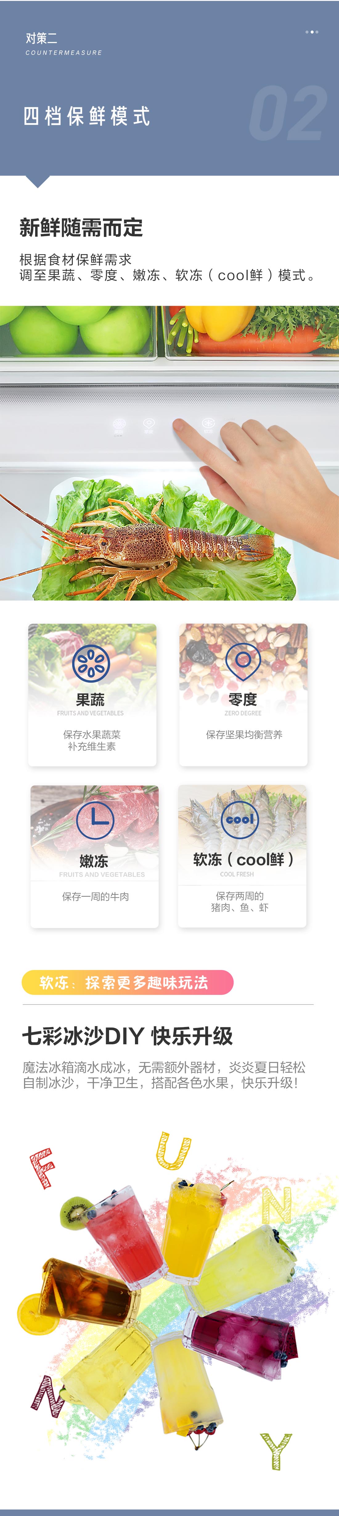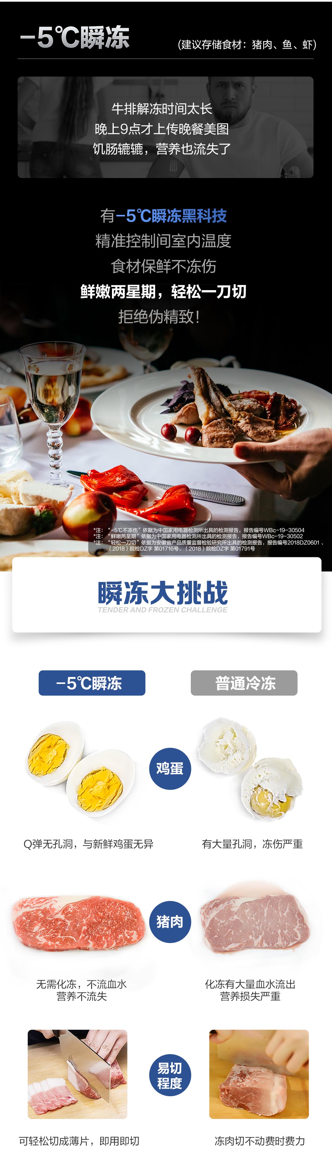 搭載-5℃瞬凍黑科技,鮮嫩兩星期,輕松一刀切。細胞級養(yǎng)鮮,營養(yǎng)流失少。搭載-3℃嫩凍黑科技,食材不結(jié)冰,鮮嫩一整周。智能全變頻技術(shù),恒溫保鮮,節(jié)能靜音。
