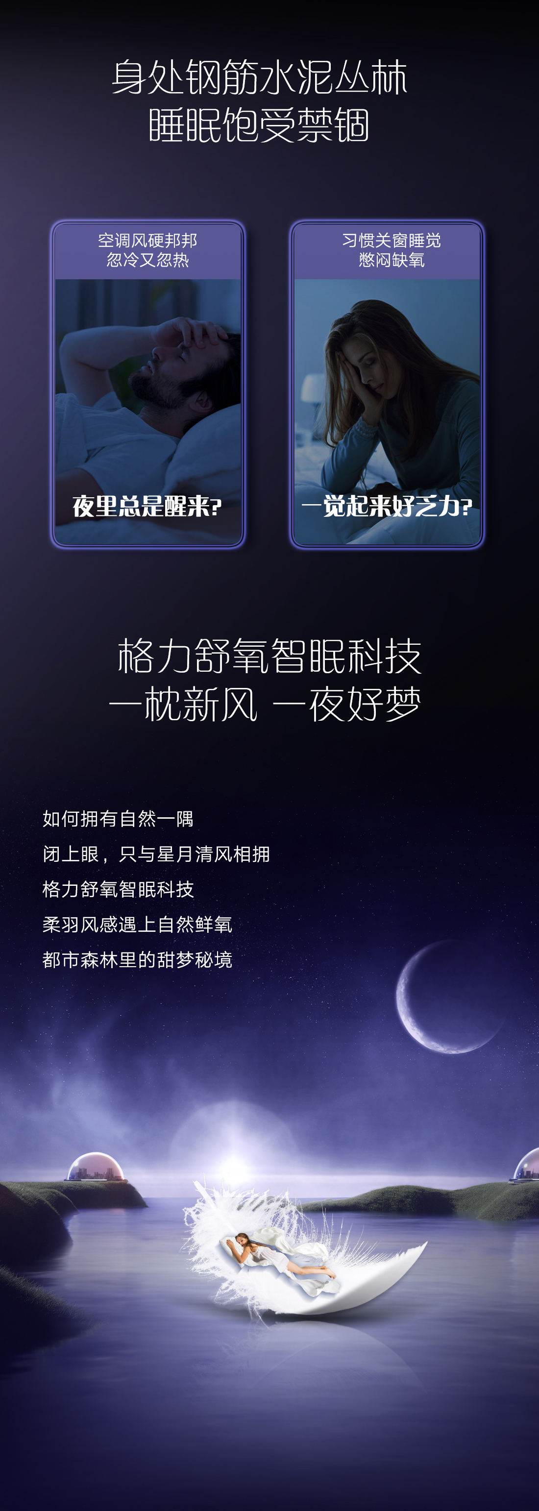渾然天成,一個(gè)優(yōu)雅的治愈系。仿星緞布紋工藝,星光點(diǎn)點(diǎn),織錦伴夢(mèng)。舒氧智眠科技,柔羽風(fēng)感遇上自然鮮氧,臥室成為身心的棲居圣地。情緒回緩,一夢(mèng)天光。